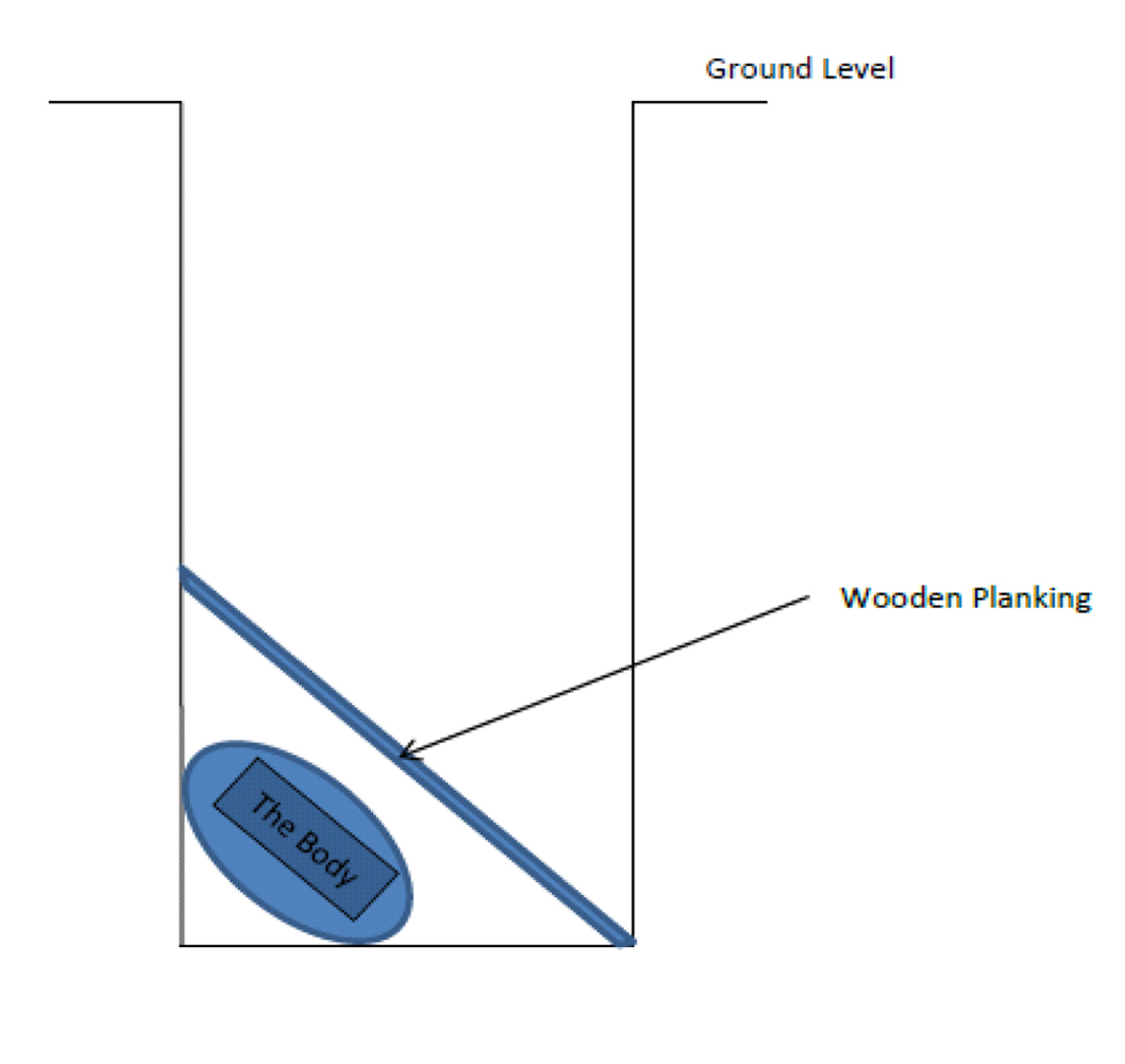 Once the body has been lowered into the grave, has been orientated correctly and the shoring at that corresponding depth removed, individual wooden planks approximately L 39”x W 8.5” x H 1.75” (the actual length of the planks will be determined by the excavated grave size; the size L 39”x W 8.5” x H 1.75” would be that suited to a normal adult size grave) will be placed side by side inside and along the entire length of the grave as per Fig 1 below. Only then can phased backfilling of the grave begin as the grave shoring is removed in a phased procedure.
