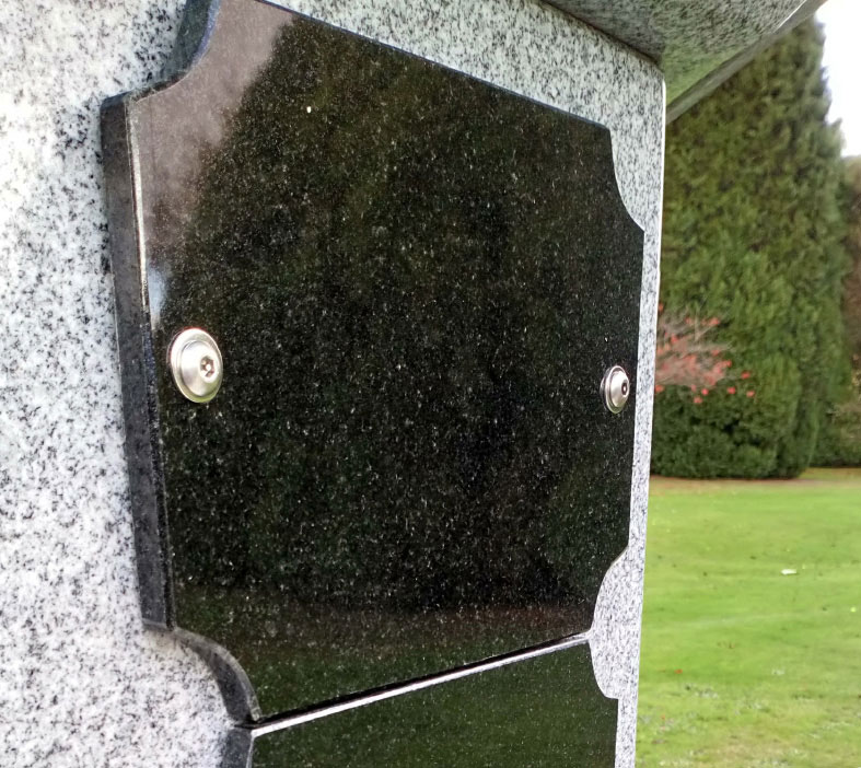 Each plaque is a 7×5” corner tablet in black granite with gilded lettering, it can be personalised not only by the inscription but also the addition of a ceramic photo plaque, emblem or design at an additional cost.